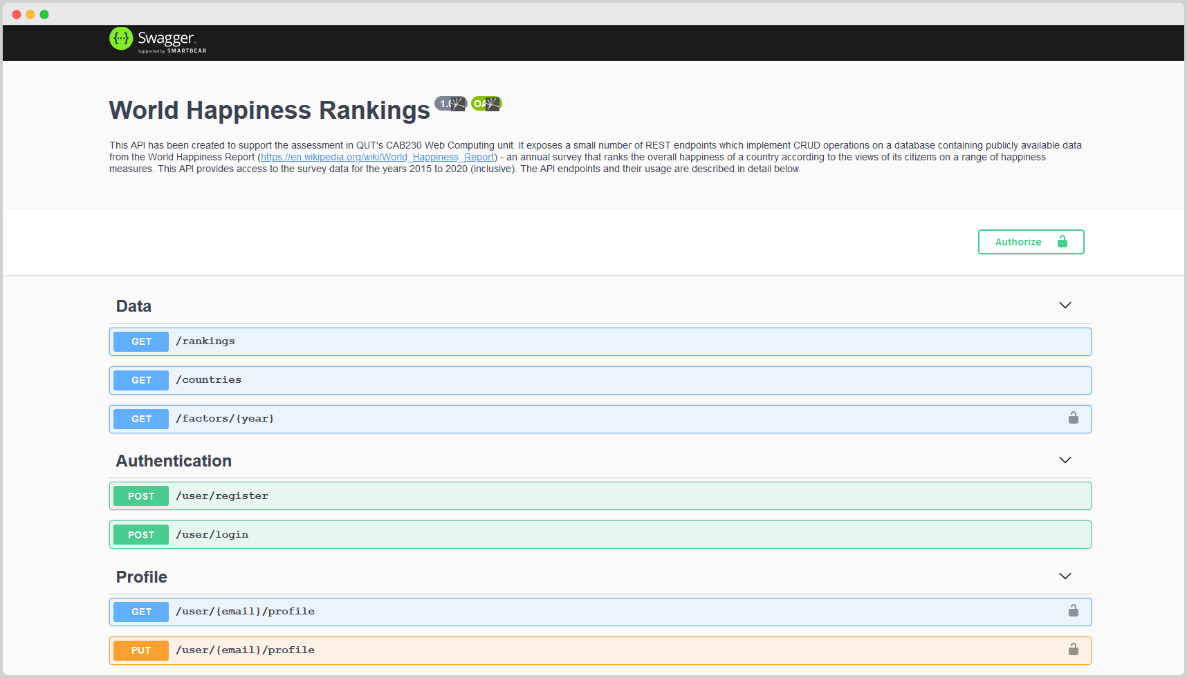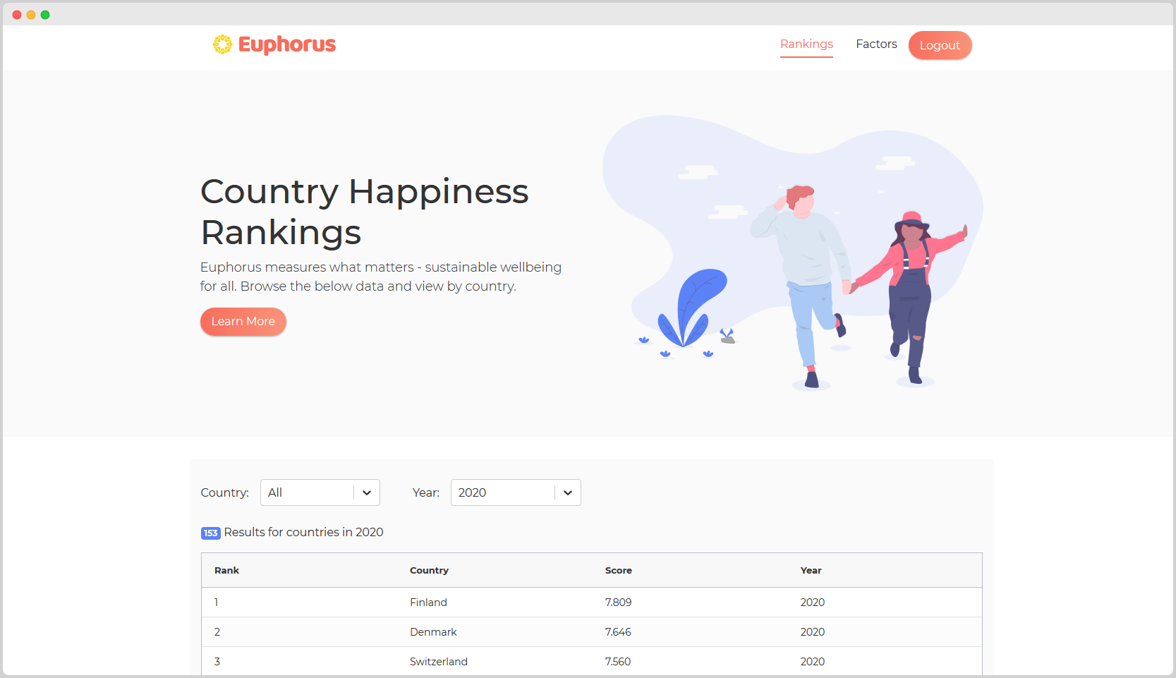 Developed and deployed an Express API to support the front-end of the Euphorus Happiness Data web application. Routes support query parameters and authorization using JWT. Includes endpoints for countries, rankings, factors, registration, login, and profile. Tested software extensively with Jest. Created Swagger documentation for the API as well.